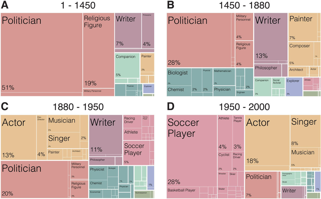This chart makes use of the Pantheon 2.0 dataset, and tells us about biographies published in the periods shown in the four sections of this chart. There is a lot to take away from this analysis, and I imagine the presentation at an economics conference would have gone on for hours (how did you take into account changing technologies? How much of this was supply drive and how much by demand, and how did you model for it?... and on and on and on). But I hope you'll agree - this is fantastic to look at and ponder over.
