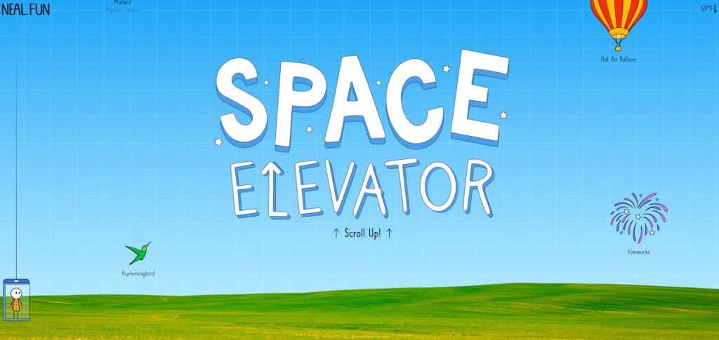 The Space ElevatorAshish KulkarniMar 24, 2024ShareWhat a fun website for a Sunday morning!https://neal.fun/space-elevator/