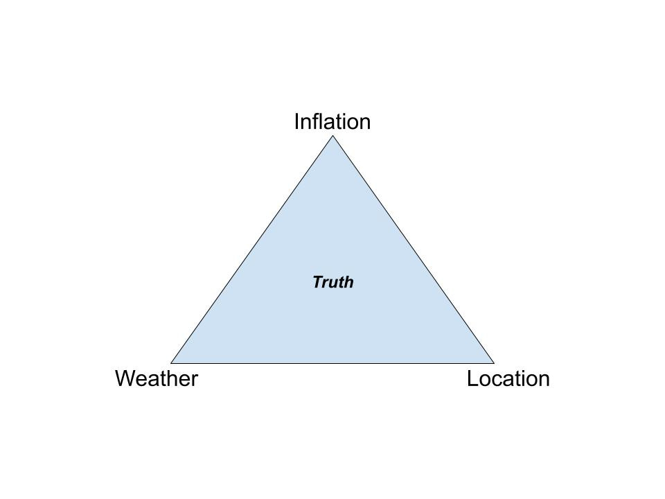 In fact, it's worse, because for reasons discussed above, the truest shape to surround The Truth is some impossibly complicated polygon. We've chosen to abstract away from this polygon only three factors, and so we have the luxury of thinking about where The Truth might lie in this triangle.