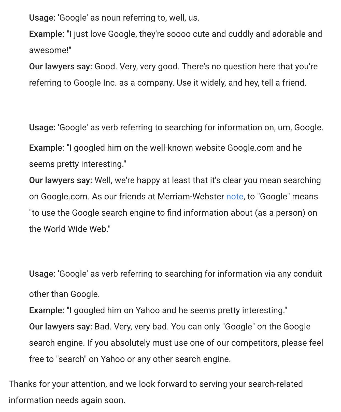 Michael was on the Google Blog team, and the reason he wrote this post was to make sure that Google didn’t suffer from the same fate. The post was an admonishment to all of us, to make sure that we used Google correctly, especially if we were going to use it as a verb: