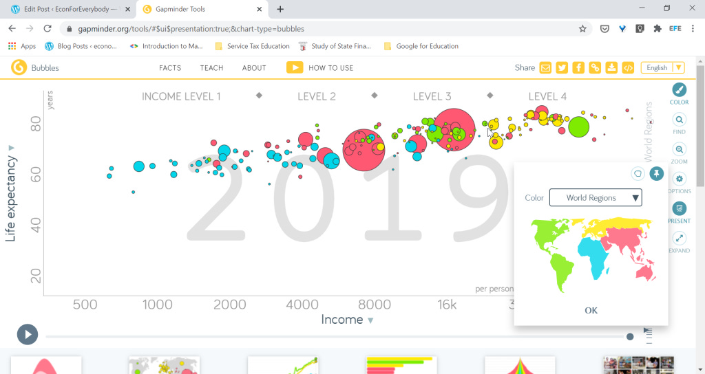 Inflation adjusted, purchasing power parity adjusted per capita income for each country is plotted against the life expectancy for the citizens of that country. The color coding shows you which part of the world that country is from, and the size of the bubble indicates the population in that country.