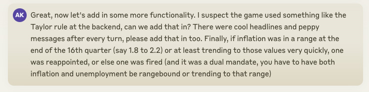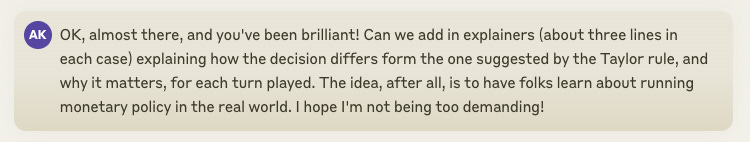 And to any students of economics (or any subject, for that matter) reading this - build working demos. Any topic that fascinates you, interests you, is going to be of use in your careers - use LLM's to build working models, and share it with the world.