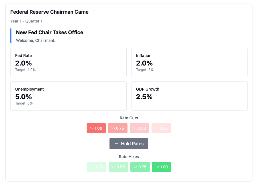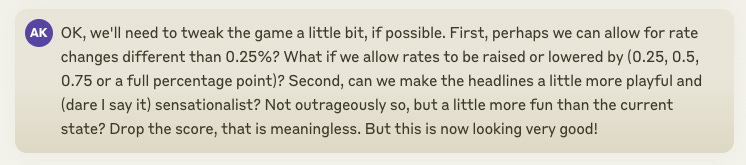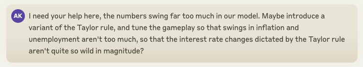 By the way, I'm fairly sure it was a modified Taylor rule that was being used in the game, but I'm not sure what the exact specification was. Does anybody know? Anyway, further changes were necessary, and so on I went: